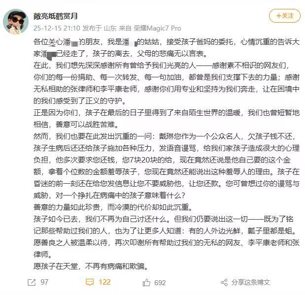 然而,我们也要在此发出沉重的一问:戴琳您作为一个公众名人,欠孩子钱不还,孩子生病后还还给孩子施加各种压力,发语音谩骂,给我们家孩子造成很大的心理负担,他多次要求您还钱,您7块20块的给,现在竟然还说是他自己要的这个金额,拿着个位数的金额羞辱孩子,您现在竟然还能说出这种羞辱人的理由。孩子在昏迷的前一刻还在给您发信息让您不要威胁他,让您还款。您可曾想过你的谩骂与威胁,对一个挣扎在病痛中的孩子意味着什么?